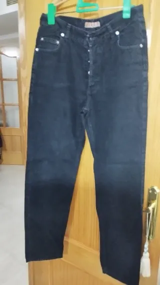 Pantalones vaqueros unisex de color negro con cierre de botones. - Diseño clásico. - Tejido resistente.