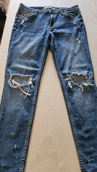 Pantalones vaqueros estilo pitillo, en excelente estado, casi como nuevos. - Cintura elástica con fruncido. - Detalle de rotos y desgastes. - Abertura con botones en los bajos.