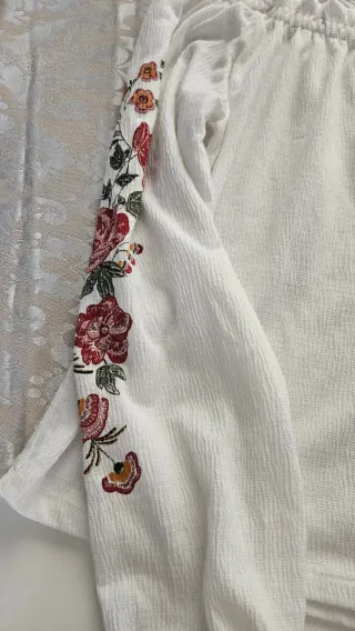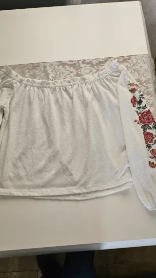 Blusa blanca de Bershka con un diseño original. Medidas en las imágenes - Estilo hombros descubiertos. - Mangas largas con bordado floral. - Tejido texturizado.