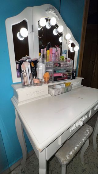 Elegante tocador de maquillaje con espejo triple y luces integradas. - Diseño clásico en color blanco. - Espejo central con dos laterales abatibles. - Luces LED decorativas. - Cajones para almacenamiento. - Incluye taburete a juego.