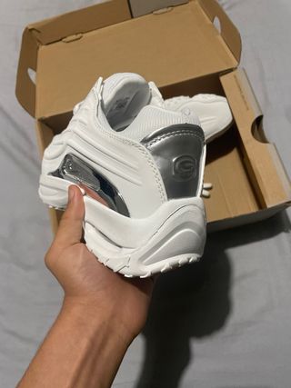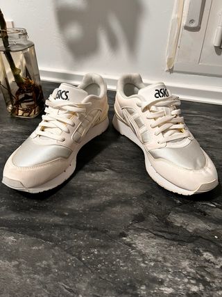Zapatillas deportivas Asics con un diseño moderno y cómodo. - Combinación de colores plata y blanco. - Talla 44.