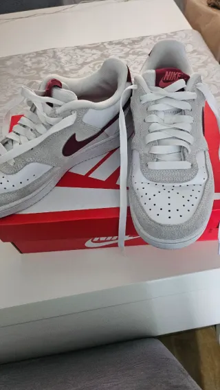 Zapatillas deportivas Nike con un diseño moderno y llamativo. Unisex - Combinación de blanco y detalles en rojo burdeos. - Materiales de ante y piel sintética.