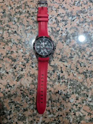 Reloj Festina con diseño deportivo y detalles en rojo. - Esfera negra con subesferas. - Correa de caucho roja. - Bisel giratorio.