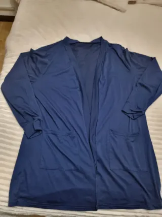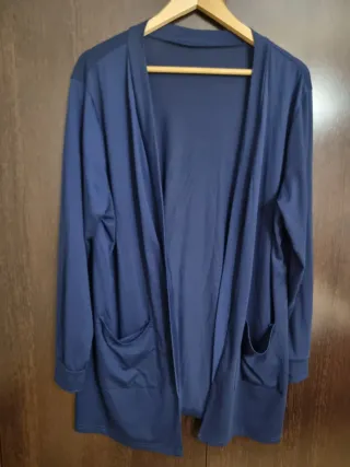 Cárdigan de manga larga en un tono azul marino. Es una prenda cómoda y versátil. Talla 2xl De axila a axila 61 cm Largo 78 cm - Dos bolsillos frontales. - Diseño abierto sin botones. - Tejido suave y ligero.