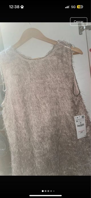 Camisa de Zara con un diseño texturizado y detalles en el cuello. - Material con acabado peludo. - Adorno de cuentas en el escote. - Diseño sin mangas.