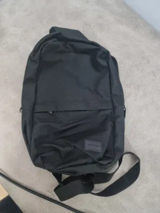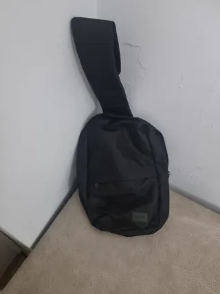 Bolso bandolera negro conocido como mochila cruzada o sling bag.Un tipo de bolso versátil y práctico que se lleva con una sola correa que cruza el pecho o espalda