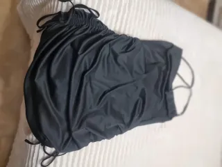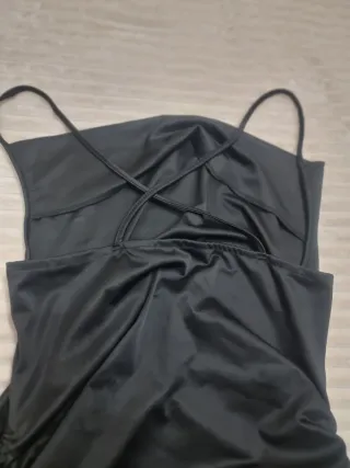 Vestido corto negro con detalles fruncidos en los laterales y tirantes finos cruzados en la espalda tejido elástico se adapta al cuerpo. De axila a axila 49 cm Largo 80 cm
