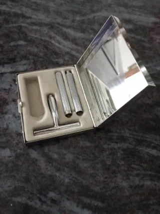 Este set de afeitado de viaje es compacto y elegante, perfecto para llevar contigo. - Incluye maquinilla de afeitar desmontable - El compartimento vacío es para la cuchilla - Estuche metálico con espejo interior.