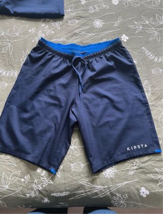 Pantalón corto deportivo de la marca Kipsta. - Cintura elástica con cordón. - Detalle de color azul en los bajos y el interior de la cintura. - Logo de la marca en la pernera derecha.