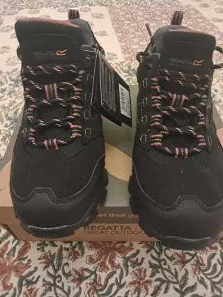 Zapatillas de senderismo para mujer de la marca Regatta. - Color principal negro con detalles en rosa. - Diseño de caña media. - Cierre con cordones. - Suela de goma. - Material exterior textil.