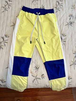 Pantalón de chándal con un diseño moderno y llamativo. - Cintura elástica con cordón. - Paneles de color en amarillo, azul y blanco. - Tejido ligero y cómodo. Usado una vez.