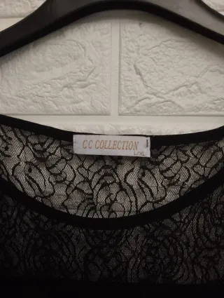 Camiseta de manga larga con un diseño elegante y moderno. Largo 65cms. Hombros 41 CMS. Sisa 49 CMS. - Tejido principal negro. - Parte superior y mangas de tejido de rejilla con pequeños puntos. - Escote con detalle de lágrima. - Corte favorecedor.