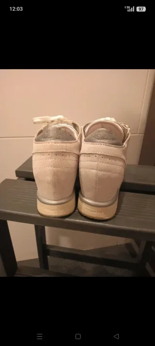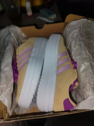 Zapatillas Adidas con plataforma. - Diseño de doble suela. - Combinación de colores beige y morado.