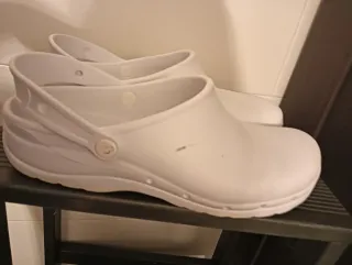 Par de zapatos de trabajo blancos. - Diseño tipo zueco. - Material sintético. - Suela antideslizante.