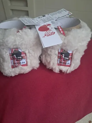 Zapatillas de estar por casa con un diseño divertido de Mafalda. Son muy cómodas y cálidas. - Material exterior de pelo sintético. - Forro interior suave. - Suela antideslizante. Talla L, equivalente a una talla 40-41.