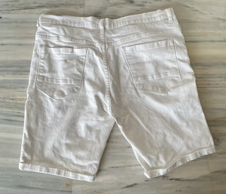 Bermuda vaquera para hombre de Primark, en color blanco. Corte slim, con diseño clásico de cinco bolsillos y cierre frontal con botones. Presenta rotos decorativos en la parte frontal, integrados en el diseño. Bajo con acabado recto. ✨ Color: Blanco ✨ Marca: Primark ✨ Talla: 48 ✨ Medidas: cintura 48-51cm / cadera 60cm / muslo 34cm / largo 52cm ✨ Composicion: 98% algodon / 2% elastano