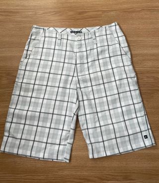 Bermuda de la marca Quiksilver con un diseño de cuadros. - Estampado de cuadros grises y blancos. - Detalle del logo de Quiksilver en la parte inferior.