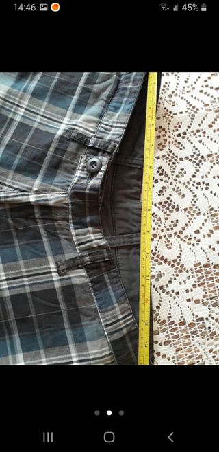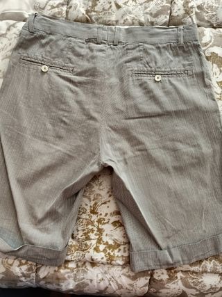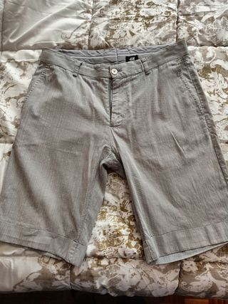 1. Bermuda reversible con un lado a cuadros y el otro liso, con cuatro bolsillos de Easy Wear. Cintura 38cm. Poco uso. Talla M. 2. Bermuda lisa en gris Talla S. Cintura 26 cm.