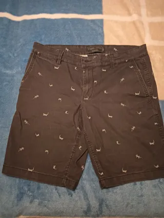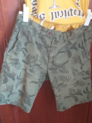 Bermudas chico, verde militar con estampado hojas verde más oscuro. Talla 38. Lote: con camiseta algodón (talla L de Lefties, 100% algodón), 5 euros. Sola, 3 euros.