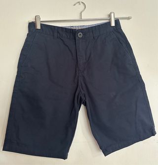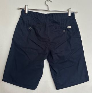 Bermuda azul marino de algodón en talla 38, con cintura con trabillas, cierre con botón y cremallera y bolsillos laterales y traseros.