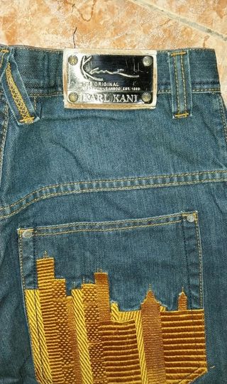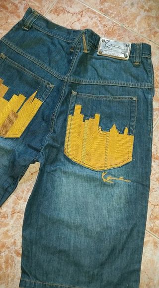 Bermudas de la marca Karl Kani con un diseño urbano. - Color azul denim. - Detalle de bordado dorado con silueta de ciudad en los bolsillos traseros. - Parche metálico de la marca en la cintura. Largo 68 84 Perímetro de cintura