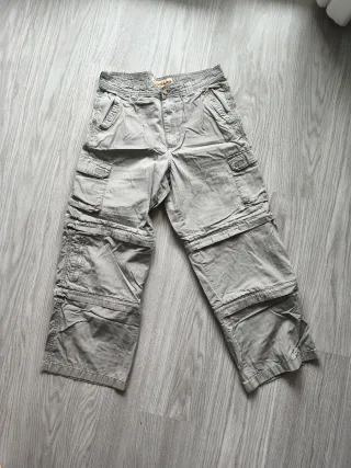 Pantalón cargo de la marca New Caro, perfecto para actividades al aire libre o uso diario. - Color grisáceo. - Diseño convertible, se transforma en bermudas. - Múltiples bolsillos tipo cargo. Talla 42. Largo 93 cm