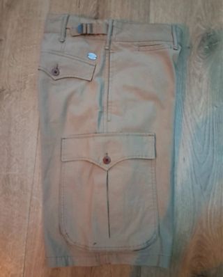 - Bermudas tostadas Dustin - Años 2000 - Cierre en bragueta con cremallera, automático y botón - Seis bolsillos: Uno en cada lateral y cuatro en el trasero, dos de ellos con cremallera - Cremallera en los bajos laterales para ampliar la pernera - Trabillas en la cinturilla - ATN: Pequeña mancha cerca de la bragueta de estar guardados - Nunca se han usado - Talla: 48 - Materiales: 100% algodón - Medidas: Ancho cintura: 48 cm Ancho cadera: 63 cm Tiro prenda: 33 cm (tiro medio) Largo prenda: 60 cm Ancho de bajo: 28 cm (cerrado) y 33 cm abierto