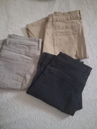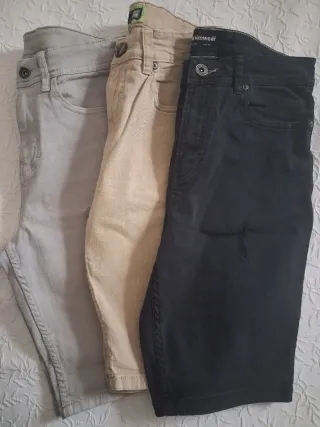 Lote de tres bermudas para chico. Son elásticos,muy cómodos. - GRIS : talla 36 - CRUDO : Talla 38 - NEGRO : Talla 40 - Bermudas de color gris. - Bermudas de color beige. - Bermudas de color negro. LOTE JUNTO : 15 EUROS POR SEPARADO: 6 EUROS LA UNIDAD.