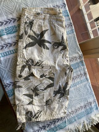 Bermudas estilo cargo con estampado tropical. - Diseño con palmeras y hojas. - Bolsillos cargo laterales. - Cierre de botón y cremallera.