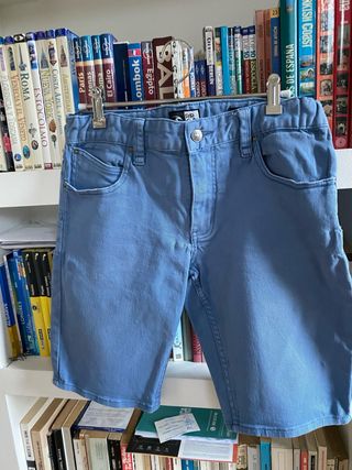 Bermudas de tela azul. - Bolsillo trasero con botón. - Trabillas para cinturón.