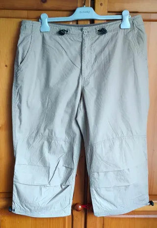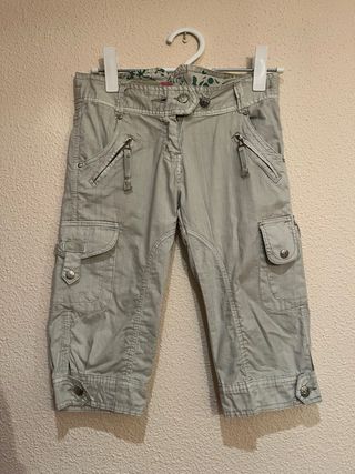 Pantalones tipo bermuda cargo en color beige/verde claro. Tienen un diseño moderno con varios bolsillos y detalles. Pantalón pirata estilo cargo (largo 3/4), ideal para entretiempo y verano. Color verde claro muy combinable. Cuenta con varios bolsillos (laterales y traseros), cremalleras decorativas y detalles metálicos que le dan un toque moderno y práctico. Tejido ligero y cómodo. Perfecto para looks casual, urbano o para viajar. Medidas: 37 cm cintura 55cm de largo 23cm de muslo
