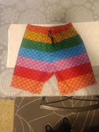 Bermudas de la marca Gucci con un diseño de rayas de colores y el icónico logo GG. - Estampado de rayas arcoíris. - Logo GG repetido en toda la prenda. - Cintura con cordón ajustable.