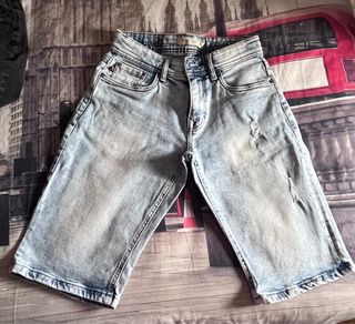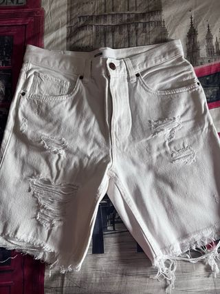 Pantalón tipo bermuda de Bershka para hombre. Un diseño moderno con un toque desgastado. - Corte recto. - Cintura con trabillas para cinturón. - Bolsillos delanteros y traseros. - Bajo deshilachado. - Con rotos 2 puestas. Practicamente nuevo.