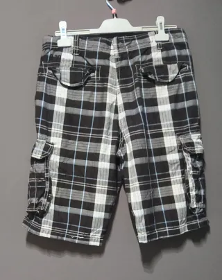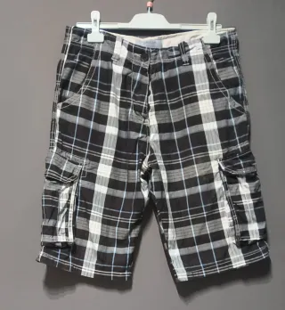 Bermudas tipo cargo para hombre con un diseño de cuadros. - Estilo cargo con bolsillos laterales. - Patrón de cuadros en blanco, marrón y azul. - En perfecto estado. - 100% algodón. - Medidas en las fotografías.