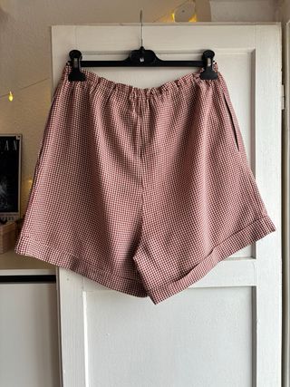 Bermuda vintage con estampado de vichy rojo oscuro y blanco. Con bolsillos laterales y con goma y ajuste a la cintura con una lazada. Talla M/L (aprox.) Recomiendo comprobar las medidas. Medidas: - Cintura: 38cm - Cadera: 53cm - Largo: 41cm #Bermuda #Vintage #BermudaVintage #PantalonCorto #PantalonVintage #Vichy #EstampadoVichy #BlancoYRojo