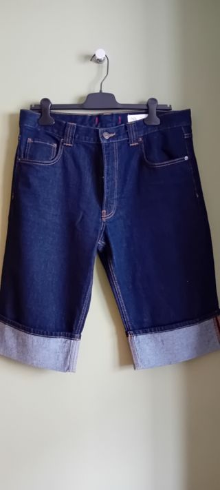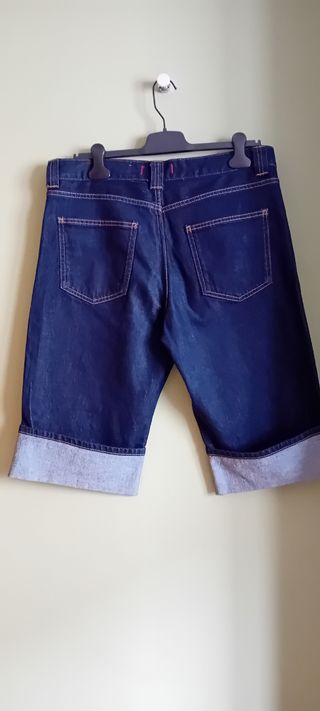Bermuda vaquera de zara, en denim oscuro con vuelta en el bajo a contraste. pespuntes a contraste. talla 40 como nuevo