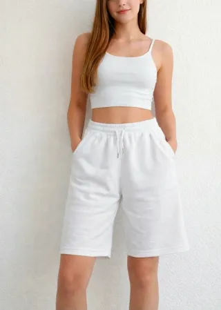 Pantalón tipo bermuda de color blanco. Diseño moderno y cómodo. Largo 65cm - Cierre con botón. - Bolsillos laterales.