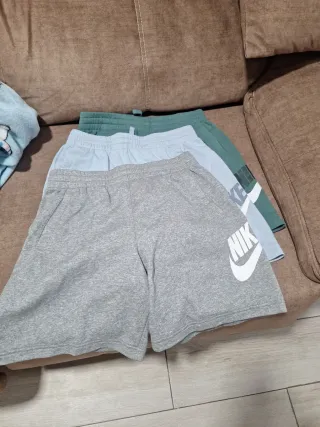 Conjunto de bermudas Nike. - Bermudas de color gris con logo blanco. - Bermudas de color verde con detalles en blanco y logo. -Bermudas de color celeste con detalle y logo blanco. Talla XL de niño 158-170