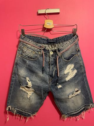 Bermuda vaquera con un estilo moderno y desenfadado. - Diseño cargo con múltiples bolsillos. - Acabado desgastado y deshilachado en los bajos. - Cintura con trabillas para cinturón.