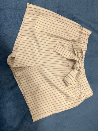 Preciosas bermudas de color amarillo. Son ideales para el verano. - Están confeccionadas en un tejido ligero y fluido. - Tienen un diseño plisado que les da un toque elegante. - Incluyen una cinta en la cintura para ajustarlas a tu medida. - Efecto falda pantalón. - Talla 10 grande, equivale a 34 XS. - Se encuentran en perfecto estado.