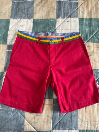 Bermudas de la marca El Ganso en talla S. Presentan un diseño moderno con detalles de colores en la cintura y bolsillos. - Cintura con bandas de colores (verde, azul marino, rojo). - Bolsillos traseros con ribete de color rojo y azul marino. - Botón y cremallera en la parte frontal.