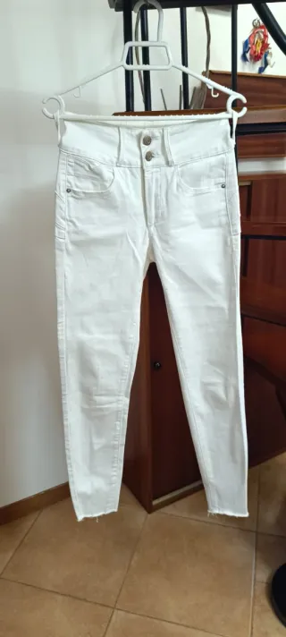 Pantalón vaquero blanco de la marca Tifosi. Son elásticos y muy cómodos. - Cintura alta con doble botón. - Bajo deshilachado. - Bolsillos delanteros y traseros.