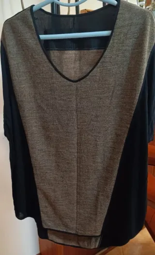 Camiseta con un diseño moderno y versátil. -Media manga - Combinación de tejidos en marrón y negro. - Cuello en pico.