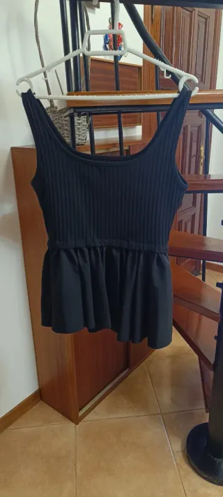Camiseta negra con un diseño acanalado en la parte superior y una falda con volantes - Tejido acanalado. - Falda con vuelo.