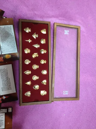 Conjunto de pines de equipos de fútbol, con acabado chapado en oro. Se vende tal cual las fotos. No se admiten devoluciones. - Pines de la temporada 2003/2004. - Incluye varios diseños de insignias. - Presentados en caja de madera.