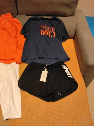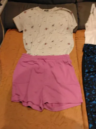 Conjunto de ocho prendas de ropa variadas.Nuevi o en muy buen estado, Bershka, Primark,Shein... - Estampado de cebra - Estampado animal print - Pantalón cargo beige - Pantalón blanco - Camiseta naranja - Camiseta azul marino con texto - Pantalón corto negro con texto - Pantalón estampado serpiente