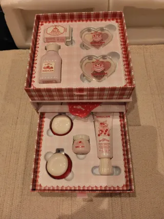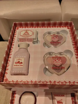 Conjunto de maquillaje viral de la colección Sweetheart de Sheglam - Incluye varios productos de belleza. 2 tarros de labios,mascarilla labios,primer lisante,colorete en crema,tónico, 2 paletas de sombras, una fresa de identificación, una caja preciosa, todo a estrenar