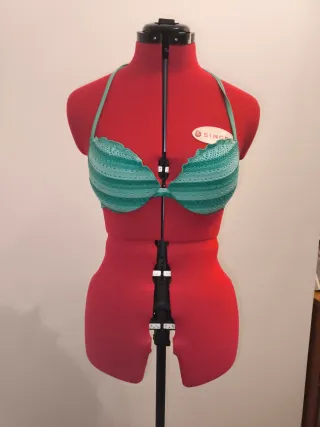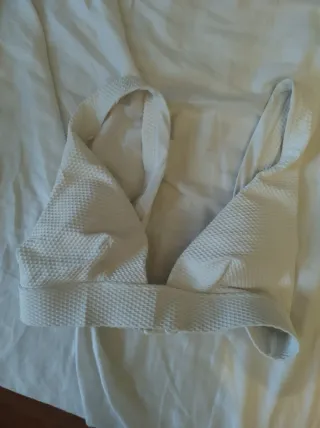 Conjunto de bikini de dos piezas con estampado clásico de rayas horizontales en color blanco y azul marino. El tejido tiene un relieve tipo "nido de abeja" o gofrado que le da un toque muy elegante y de calidad. Top: Estilo triangular con banda ancha debajo del pecho para mayor comodidad y sujeción. Los tirantes son anchos y el diseño de la espalda es limpio (sin cierres complicados). Talla S (MEX 28). Braguita: De corte clásico, muy favorecedora. Talla M (MEX 30). Estado: Nuevo con etiquetas. Conserva el protector higiénico intacto en la braguita. Ideal para un look marinero.