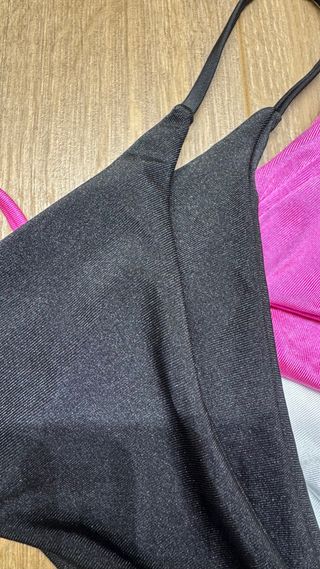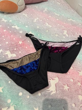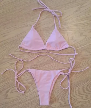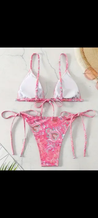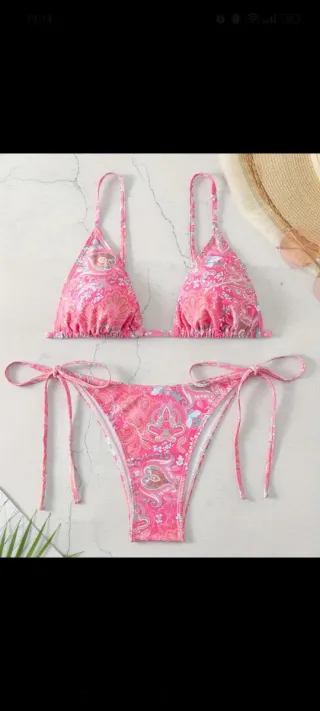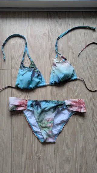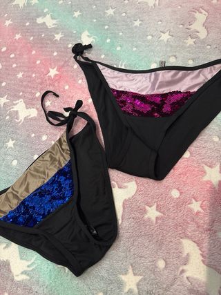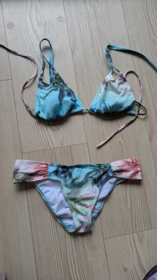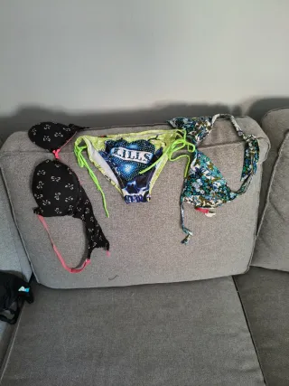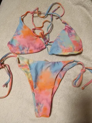 Conjunto de bikini con diferentes estampados, tie-dye, brillo, serpiente... Lo vendo por lote o por separado, preguntame 5 euros el bikini y 3 si es suelto - Diseño de triángulo en el top. - Braguita con tiras ajustables en los laterales. - Tirantes finos para anudar al cuello y espalda.
