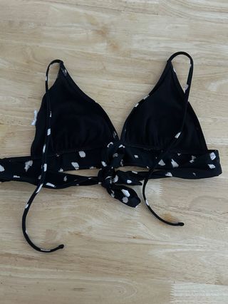 Parte de arriba de bikini con un diseño moderno y llamativo. - Estampado de manchas blancas sobre fondo negro. - Tirantes finos ajustables. - Cierre de nudo en la parte delantera.
